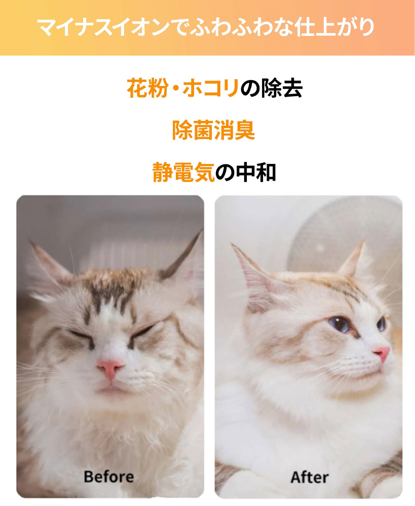 放出されるマイナスイオンで花粉やホコリも除去し、ふわふわで柔らかく仕上がります。