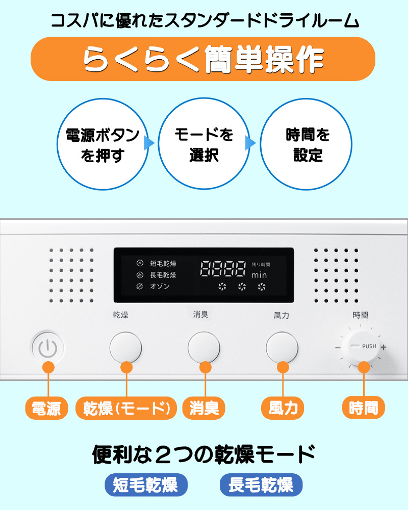 ※オゾンモードを行う際は、喚起を十分にするか、消臭を始めて2時間はドライルームにある空間に生き物が立ち入らないようにご注意ください