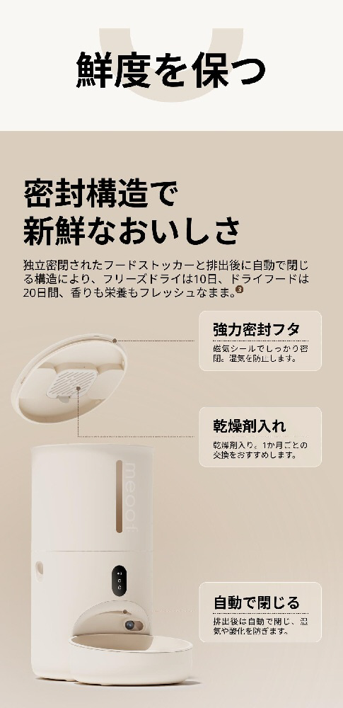 独立密閉されたフードストッカーと、排出後に自動で閉じる構造によりフリーズドライは10日、ドライフードは20日間、香りも栄養もフレッシュなままです。