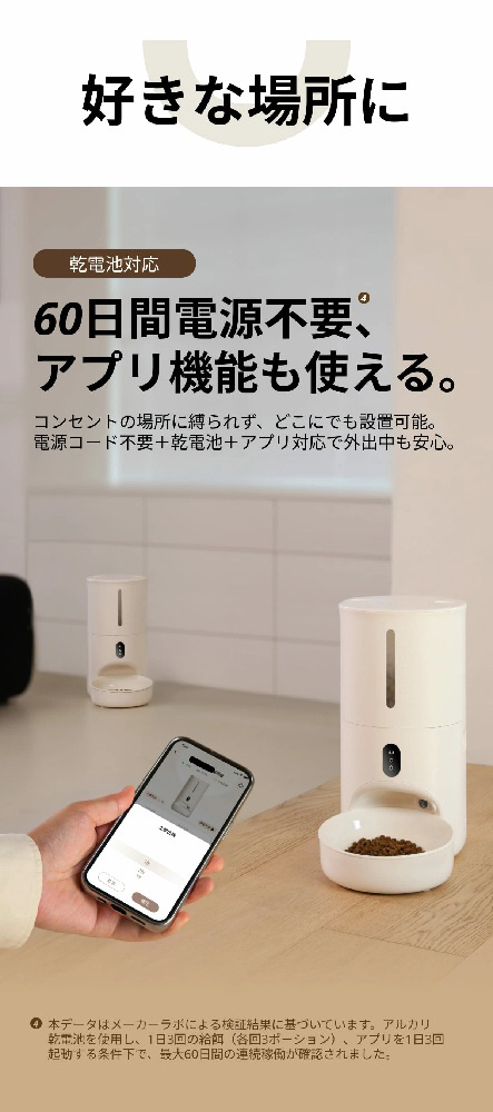コンセントの場所に縛られず、どこでも設置可能。電源コード+乾電池+アプリ対応で外出時も安心です。