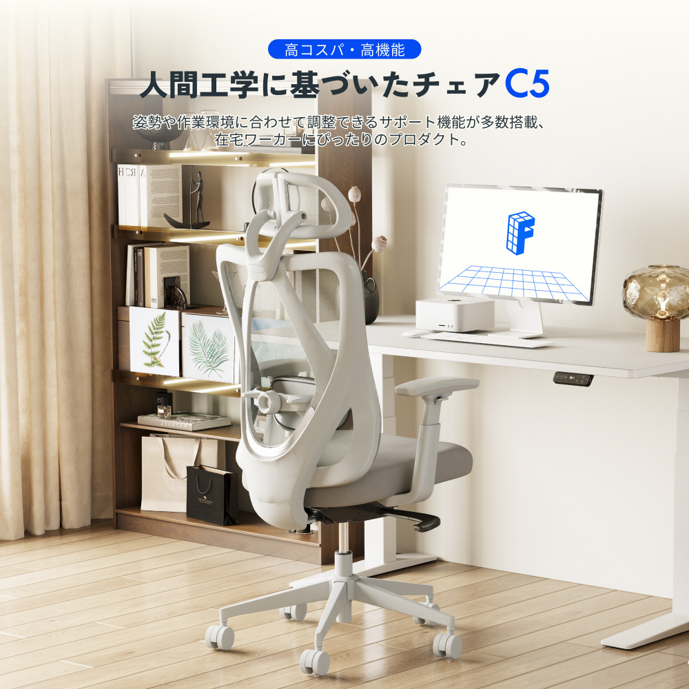 C5は高品質のメッシュ素材をヘッドレストと背もたれに採用、肌触りが良く通気性に優れます。
