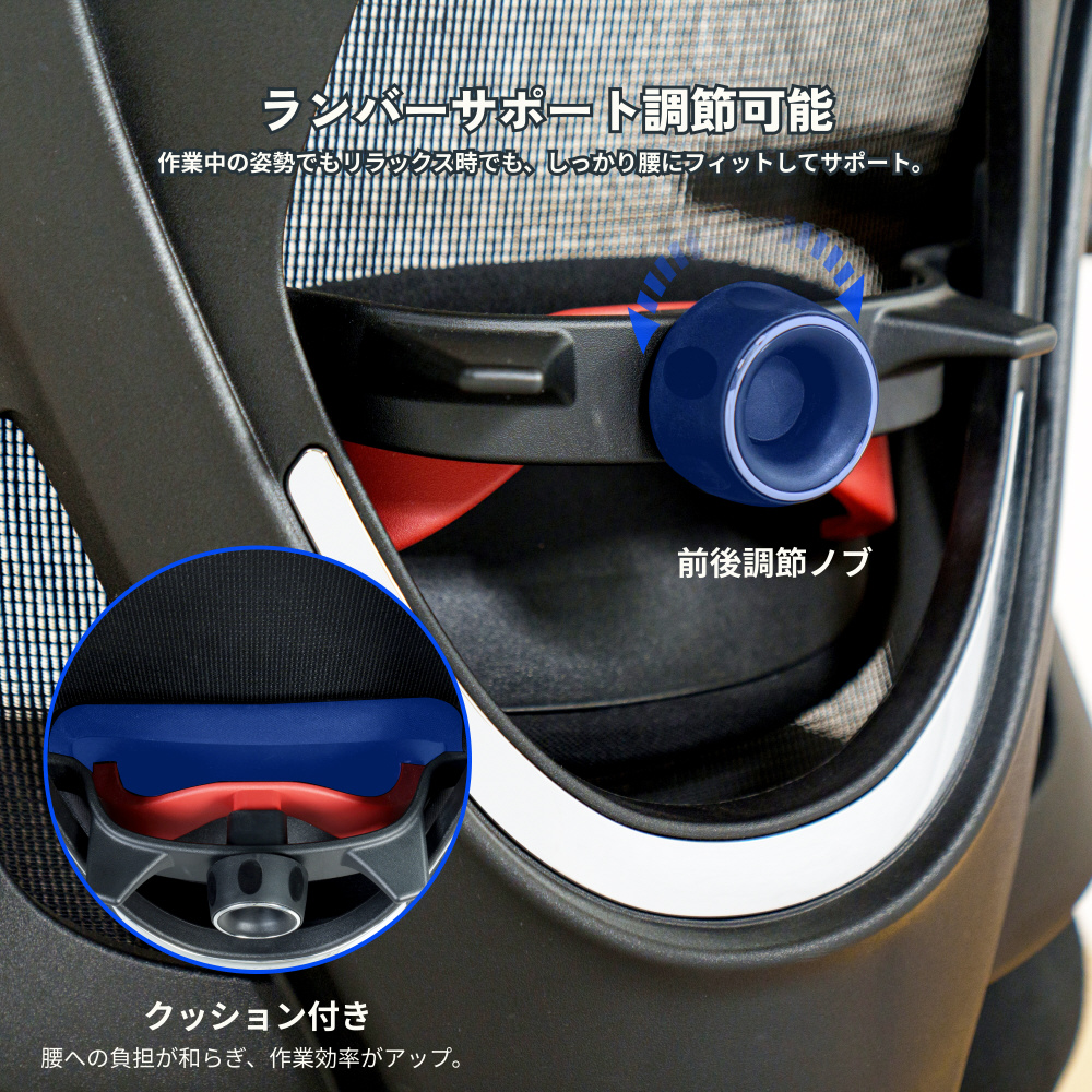 オフィスチェア・C5のランバーサポートは調節ノブで上下・前後に調節が可能。