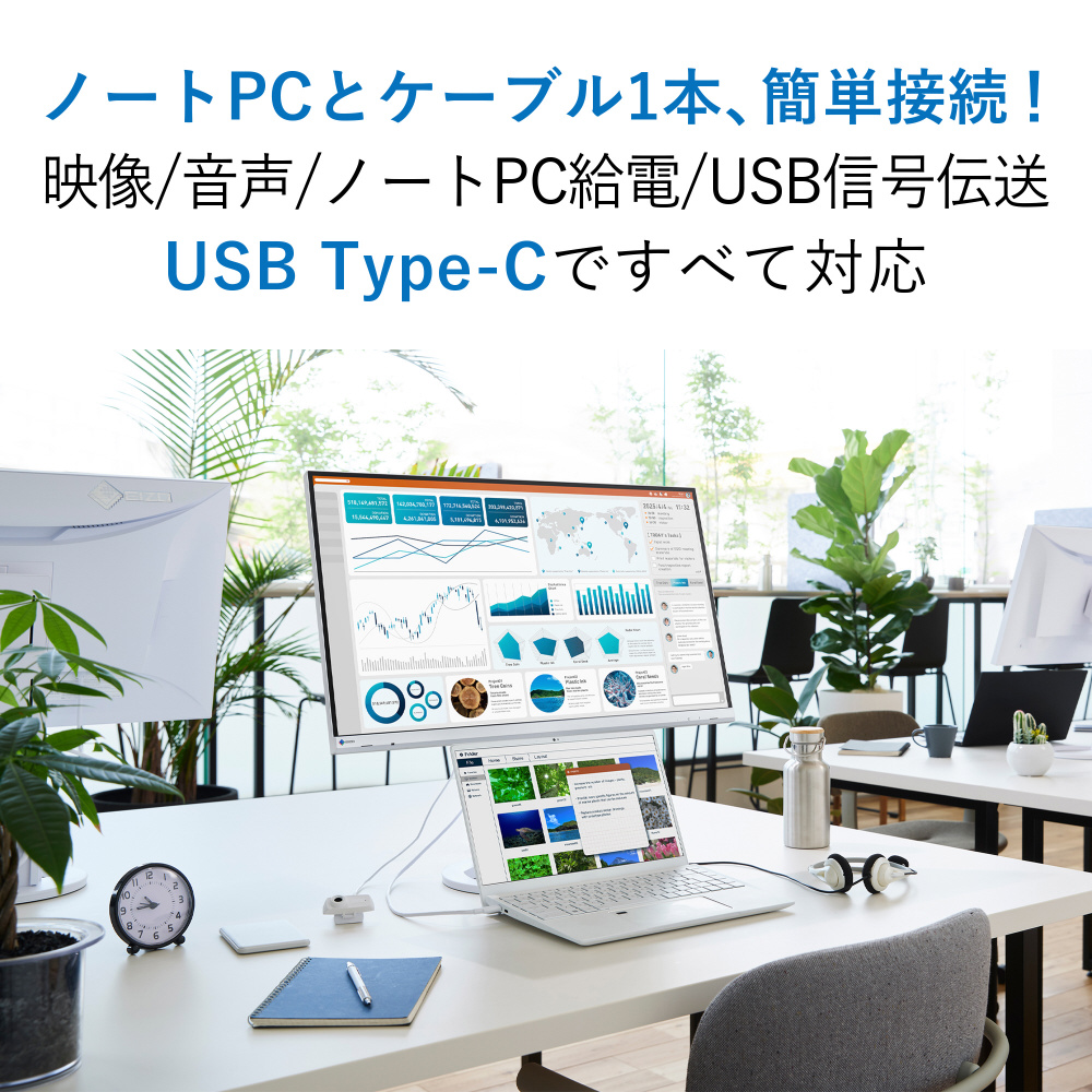 FlexScan EV2740S(以下EV2740S)は、ノートPCへの給電に対応するUSB Type-Cを搭載し、フリーアドレスやテレワーク、ハイブリッドワークなど、近年の多様化した働き方にマッチする27型4Kモニターです。