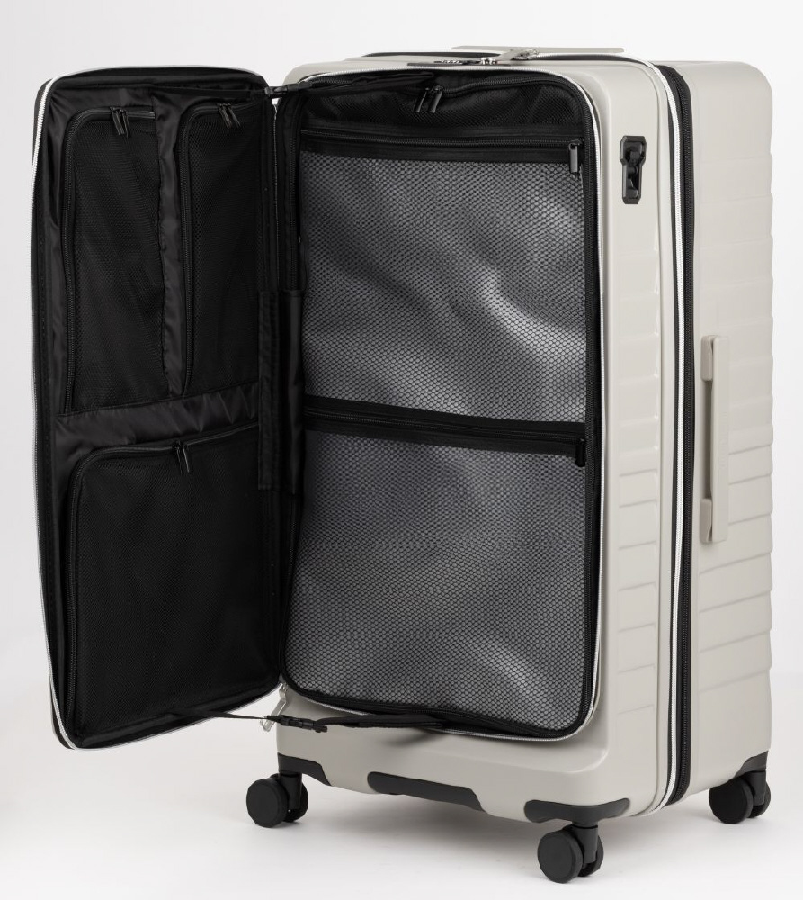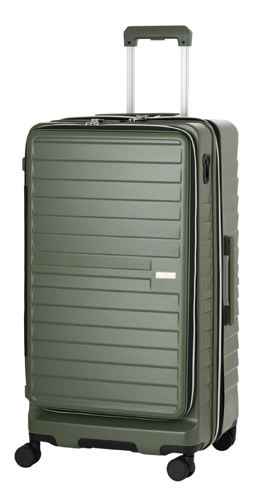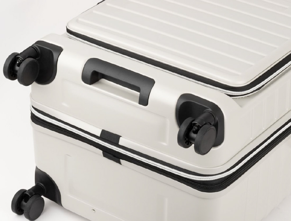 レバー式のキャスターストッパー、特殊プレート内蔵の容量拡張機能、フロントオープン仕様と多彩なファスナータイプスーツケース。