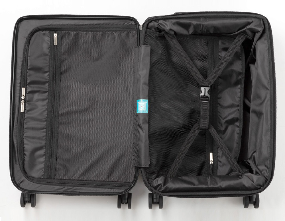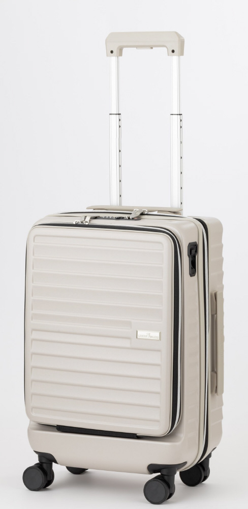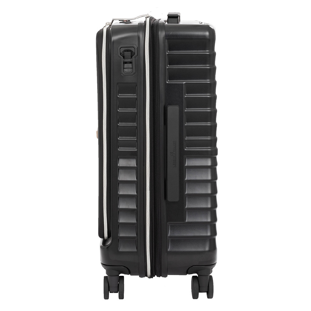 レバー式のキャスターストッパー、特殊プレート内蔵の容量拡張機能、フロントオープン仕様と多彩なファスナータイプスーツケース。