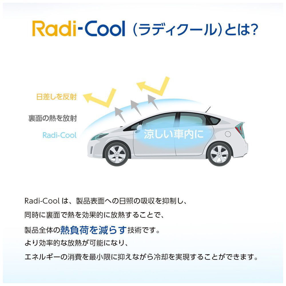車内温度15℃ダウン。Radi-Cool特許素材で涼しさUP。車内を傷つけず安心。