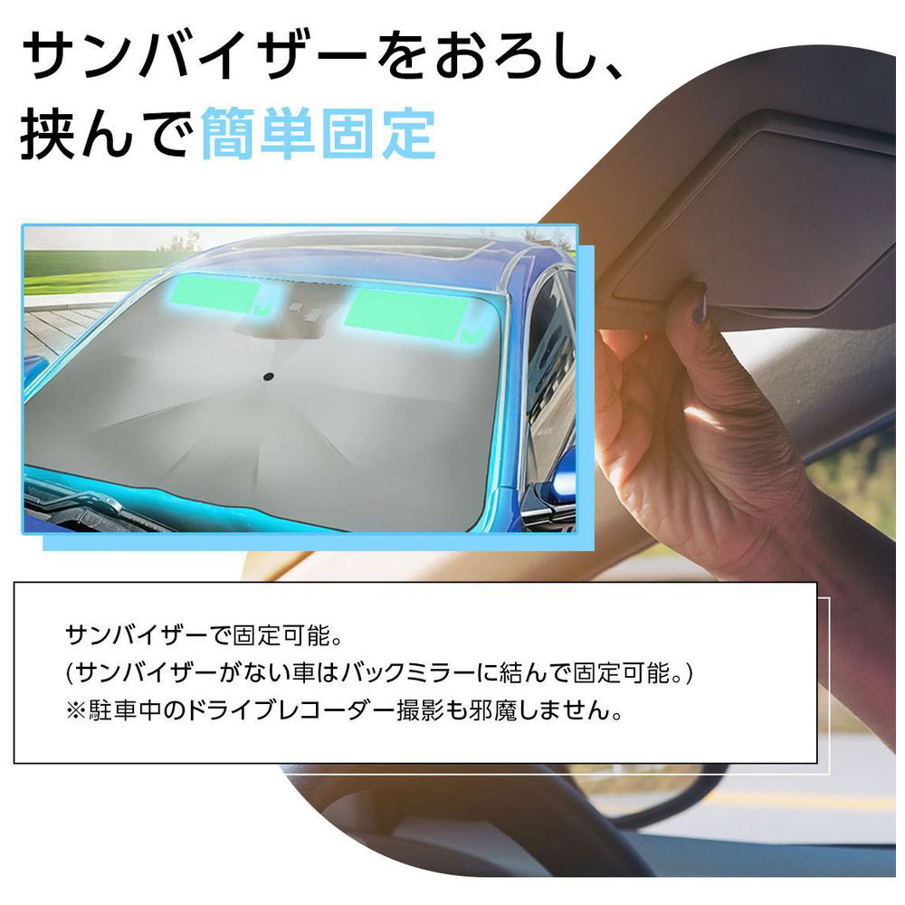 車内温度15℃ダウン。Radi-Cool特許素材で涼しさUP。車内を傷つけず安心。革カバー付きで完璧フィット。コンパクト収納袋付きで便利!