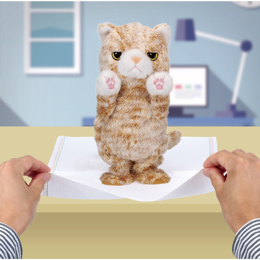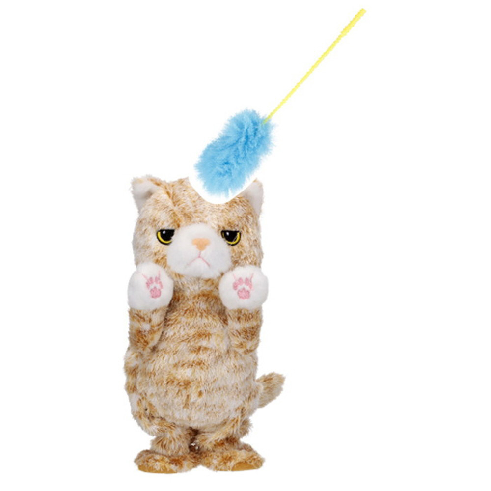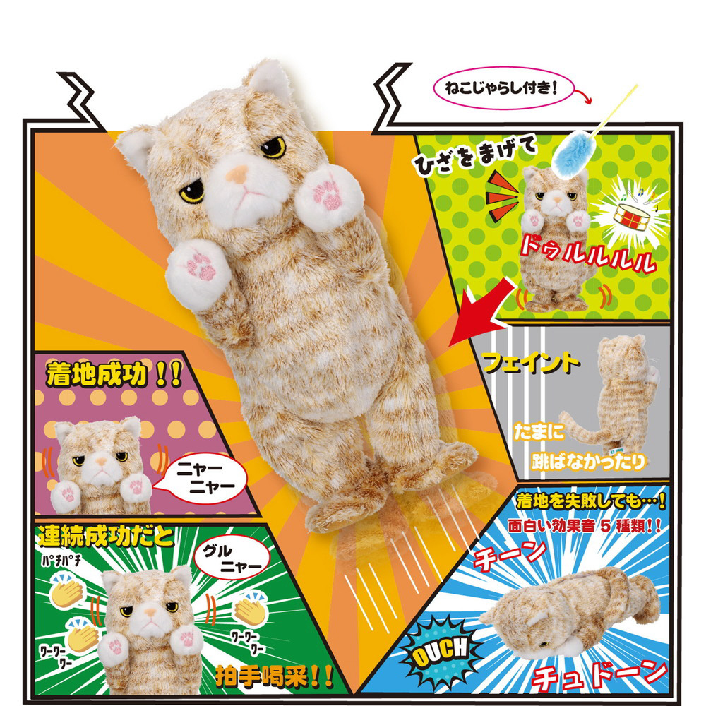 付属のねこじゃらしを顔の前でゆらすとネコちゃんがドラムロールにあわせてひざを曲げて、3連続ジャンプ!