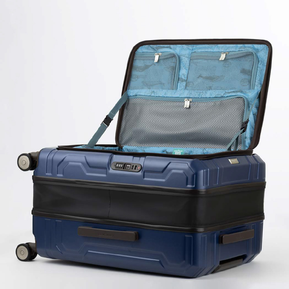 拡張ファスナーを操作することでマチ幅が約7cmアップ! フロントオープン仕様で荷物の出し入れがしやすく、 独自開発のキャスターや段階調整キャリーバーなど多機能を搭載。