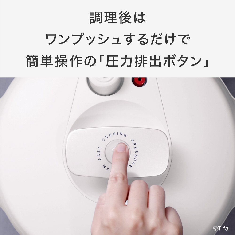 ■さらに使いやすいデザインに! 「かんたん圧力排出ボタン」で、ワンクリックでほったらかしで圧力排出が可能。キッチンカウンターなどに設置した際に角度が付いて見やすい&操作しやすい「パネル」。持ち運びしやすい「取っ手」つき本体デザインでキッチンでの移動も安心。