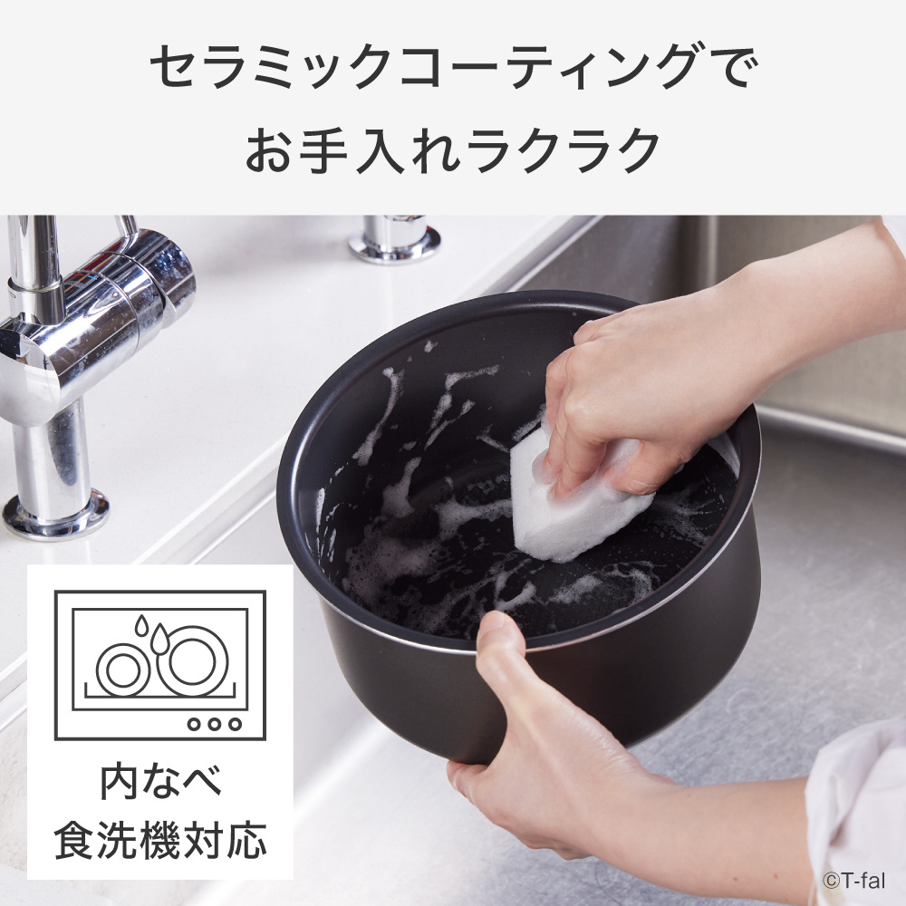 ■お手入れも簡単に! 汚れが落としやすい「セラミックコーティングの内なべ」 パーツが少ない「シンプル設計のフタ」 鍋に付いた料理のにおいを除去できる「スチーム洗浄機能」
