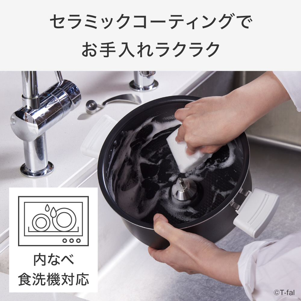 汚れが落としやすい「セラミックコーティングの内なべ」 パーツが少ない「シンプル設計のフタ」 鍋に付いた料理のにおいを除去できる「スチーム洗浄機能」
