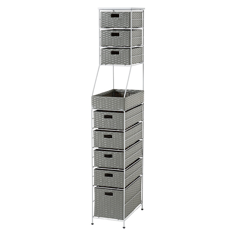 隙間におけるスリムなラタン調収納ラック。ハイタイプで引出しが多く、使用頻度によって使い分けができます。