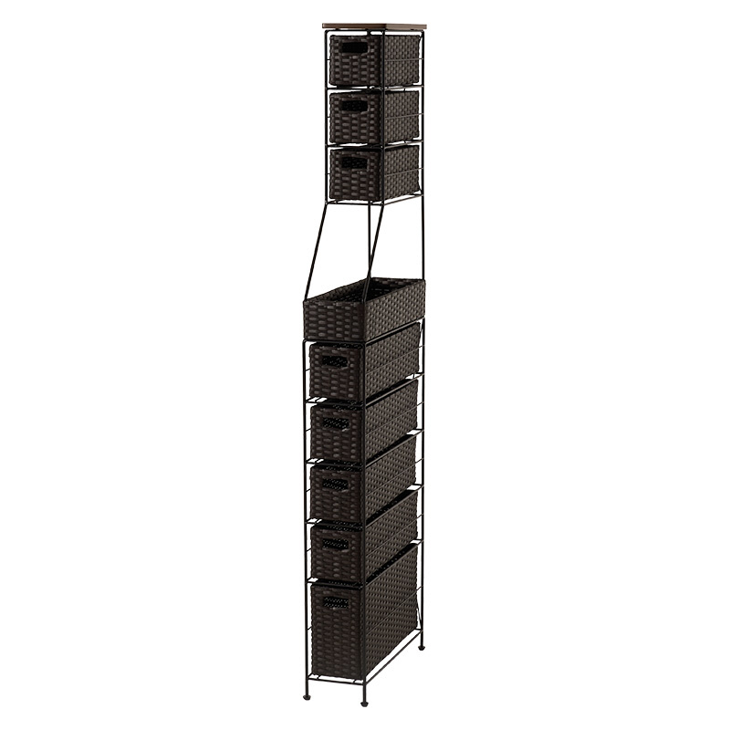 隙間におけるスリムなラタン調収納ラック。ハイタイプで引出しが多く、使用頻度によって使い分けができます。
