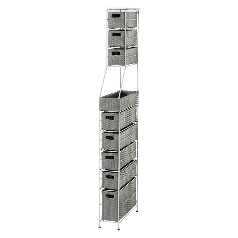隙間におけるスリムなラタン調収納ラック。ハイタイプで引出しが多く、使用頻度によって使い分けができます。