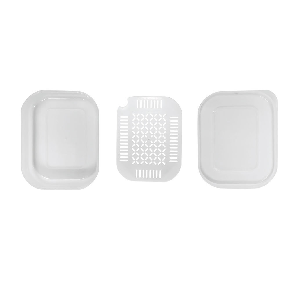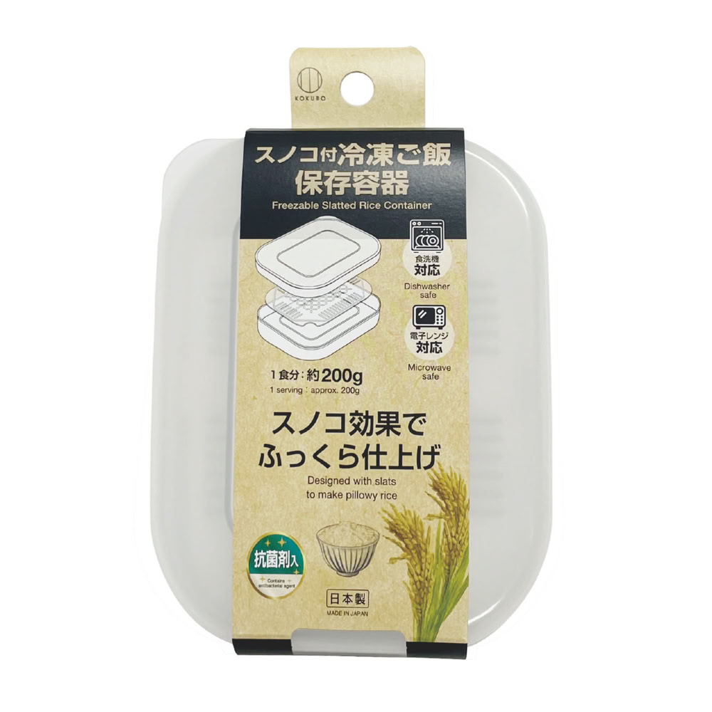 本品はポリプロピレン製の容器、スノコ、フタのセットで、ご飯を機能的に冷凍保存し、おいしく加熱するのに適しています。