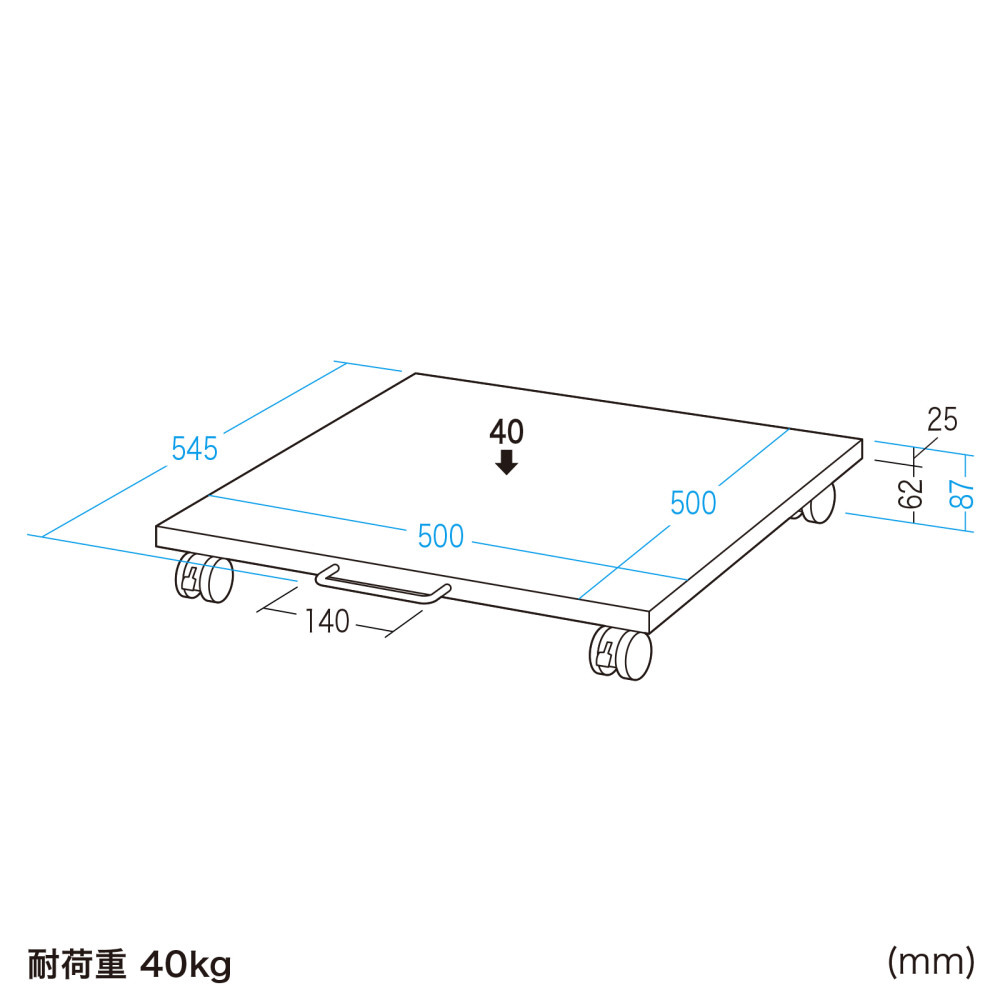 A4レーザープリンターなどをデスク下に収納できるスライド式プリンタースタンド。幅500×奥行500mm。