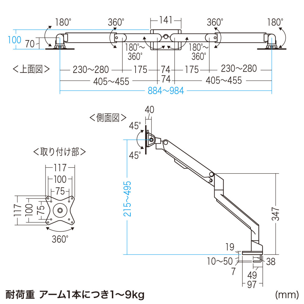[対応ディスプレイ重量]最大9kg、最小1kg