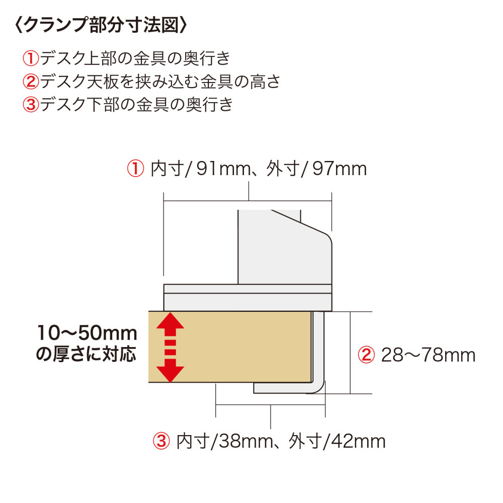■取り付けできる天板厚は10〜50mmです。
