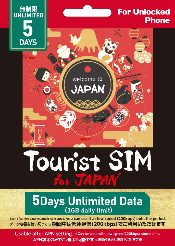Tourist SIM for Japan データ量無制限 5日間 [プリペイド/マルチSIM /SMS非対応] ※毎日3GB高速通信、超過後低速通信 [マルチSIM /SMS非対応]