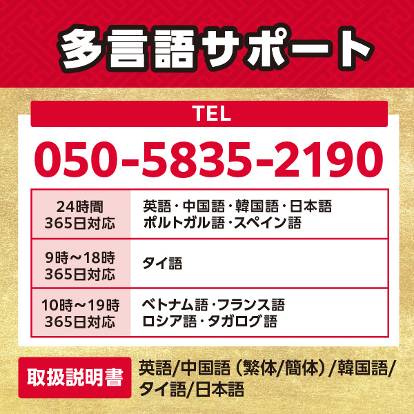 ベトナム語・フランス語・ロシア語・タガログ語:10時〜19時:365日対応