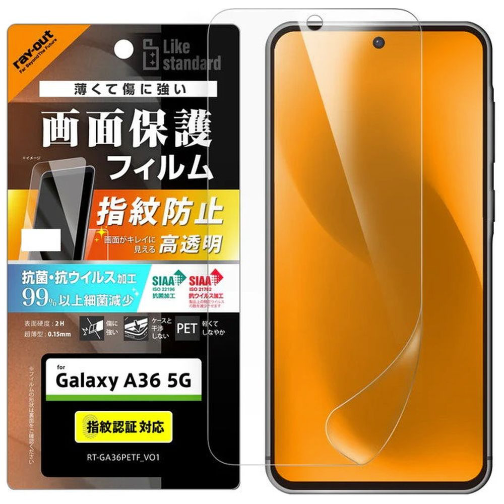 Galaxy A36 5G Like standard PETフィルム 光沢 抗菌・抗ウイルス 平面保護 指紋防止 指紋認証対応 RT-GA36F/A1