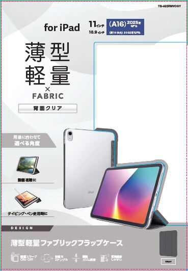 11インチ iPad(A16)、10.9インチ iPad(第10世代)用 フラップケース 薄型軽量 ファブリック 背面クリア グレー TB-A25RWVCGY