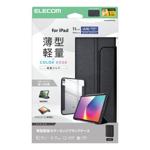 11インチ iPad(A16)、10.9インチ iPad(第10世代)用 フラップケース 薄型軽量 カラーエッジ 背面クリア ブラック TB-A25RWVFCBK