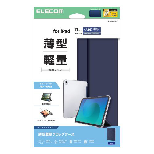 11インチ iPad(A16)、10.9インチ iPad(第10世代)用 フラップケース 薄型軽量 背面クリア 2アングル ネイビー TB-A25RWVNV