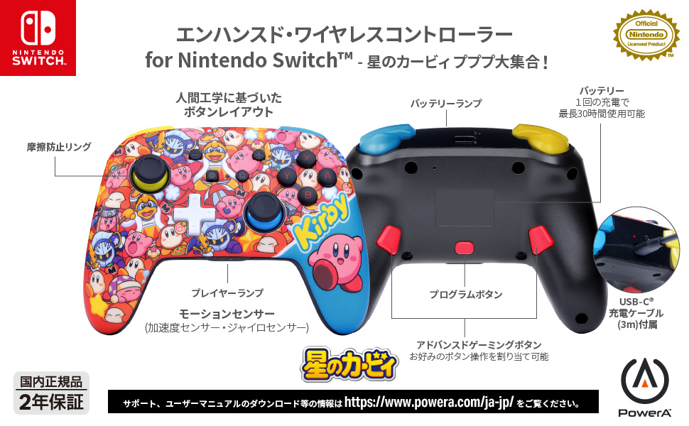 カービィのコピー能力とプププランドのなかまたちが大集合したデザインのワイヤレスコントローラー。また、ゲームのパフォーマンスを高める豊富な機能が搭載されています。 操作を割り当てられる2つのアドバンスドゲーミングボタン、直感的なモーションセンサー(加速度センサー/ジャイロセンサー対応)を使った旋回やターンなどの優れた操作性に加えて、人間工学に基づいたデザイン。