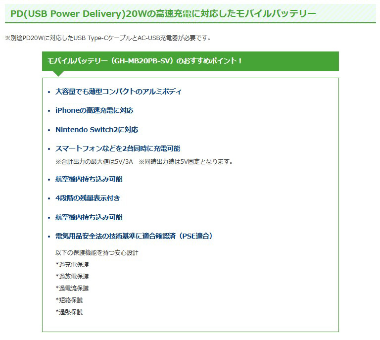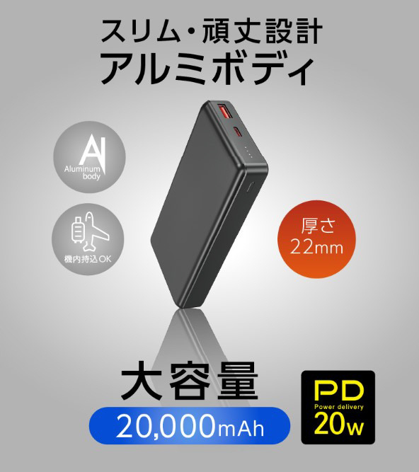 PD(USB Power Delivery)20Wの高速充電に対応したモバイルバッテリー