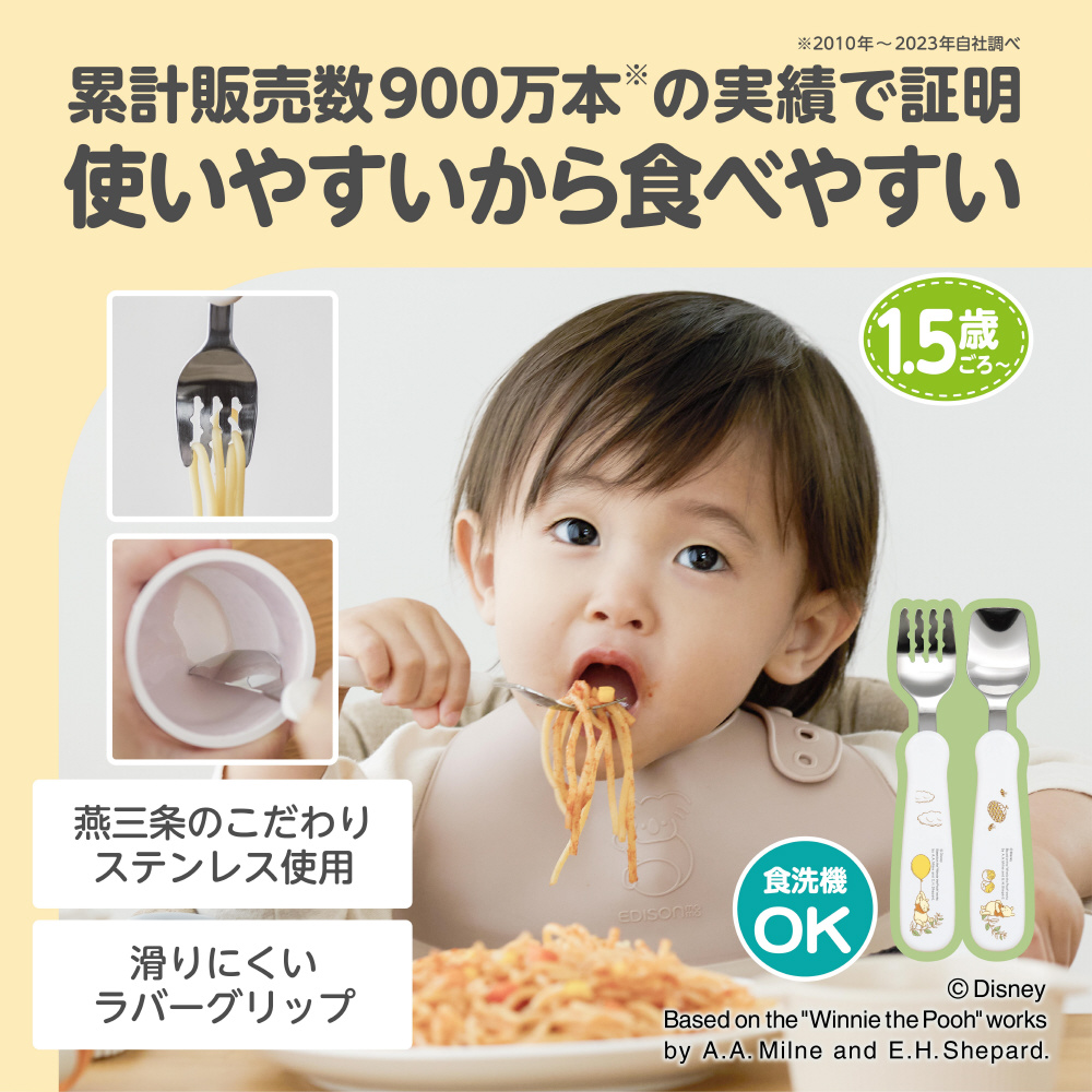 一人でも食事ができる工夫がされているから、お子様も毎日の食事が楽しくなるエジソンのスプーンにディズニーが新登場!