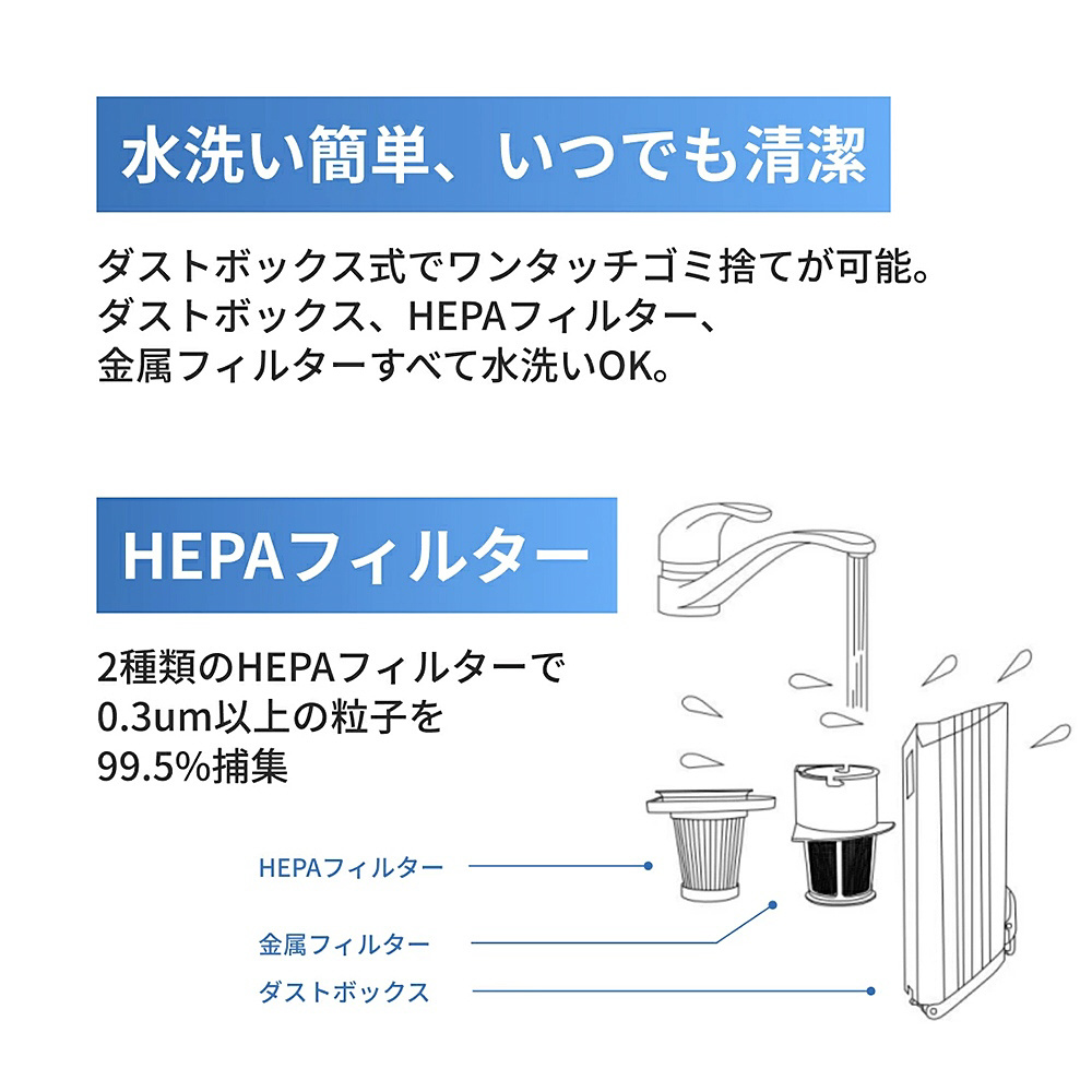 ダストボックスとフィルターは丸ごと水洗いが可能です。