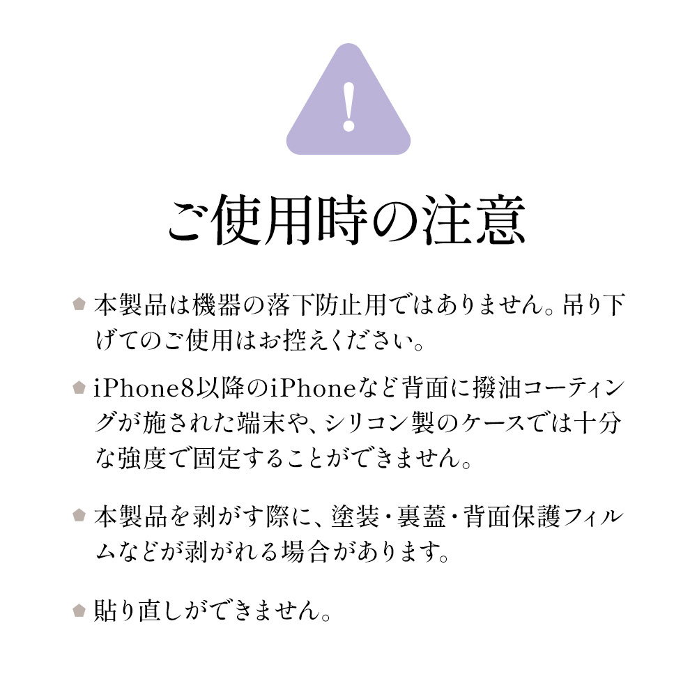 ※iPhone8以降のiPhoneなど、背面に撥油コーティングが施されたスマートフォンやシリコン製のスマートフォンケースは十分な強度で固定する事ができません。