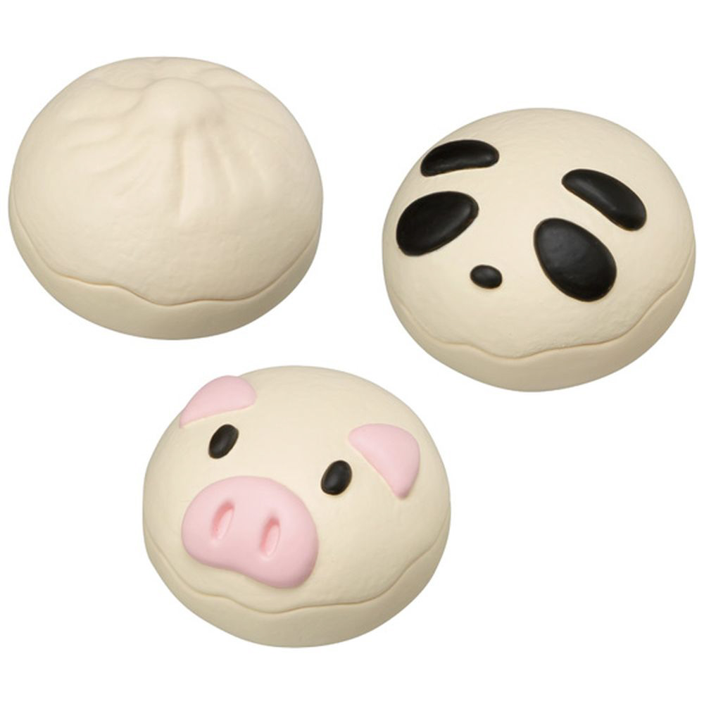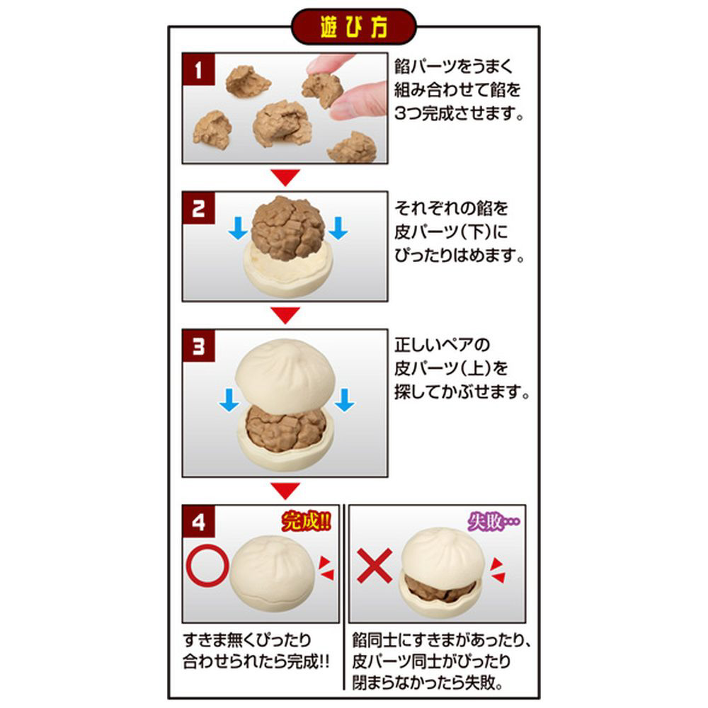 6個の皮パーツと、9個の餡パーツから正しい組み合わせを選び、組むと3個の肉まんが完成するパズルです。