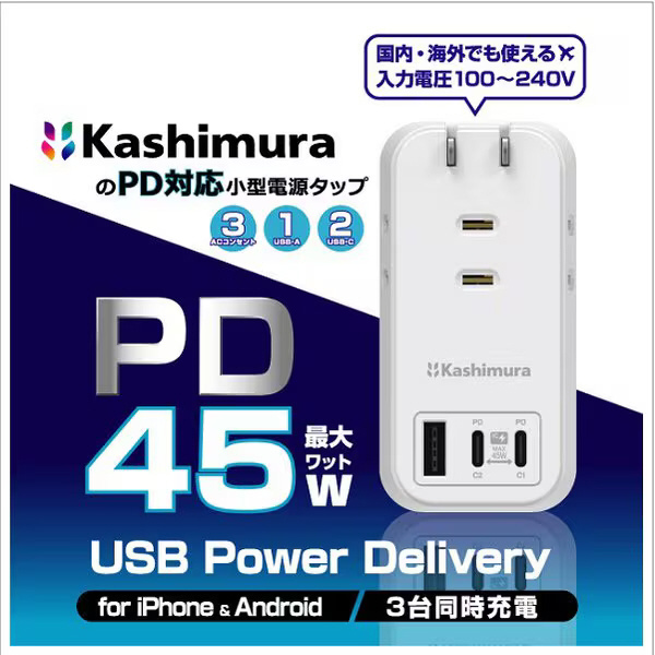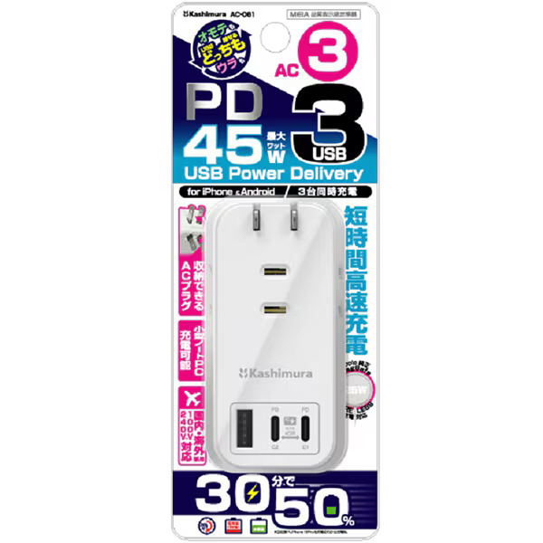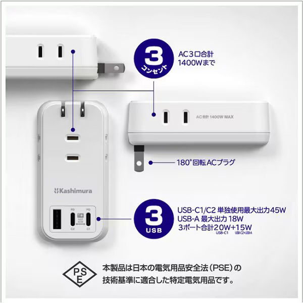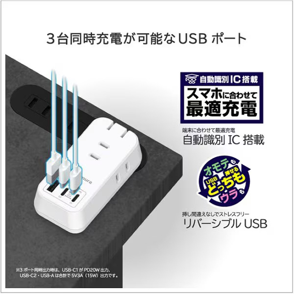 電源タップ AC3 USBA+C2 PD45W 自動識別 リバーシブル AC-061