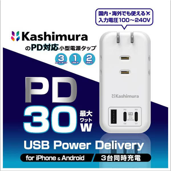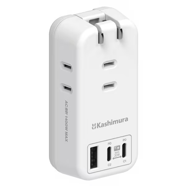 3口のACコンセントとUSB PD対応USB Type-C 2ポート+USB-A 1ポート搭載の電源タップです。
