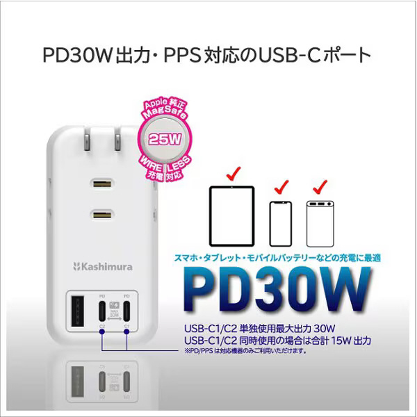 iPhone/Android対応です。3ポート同時出力時は合計で5V3A(15W)出力となります。