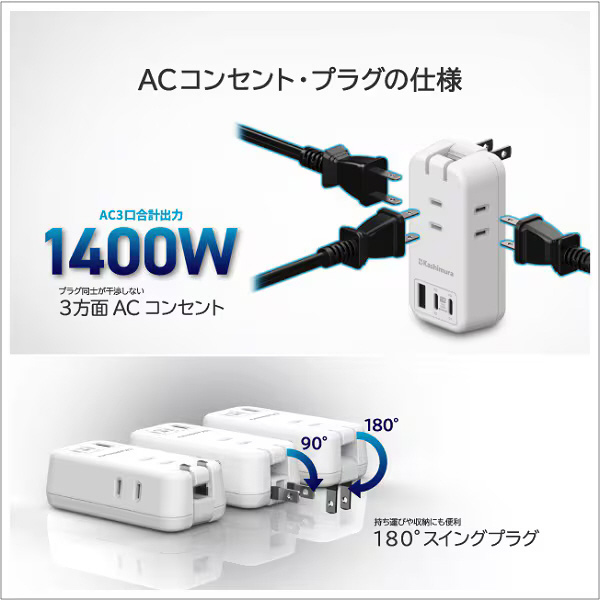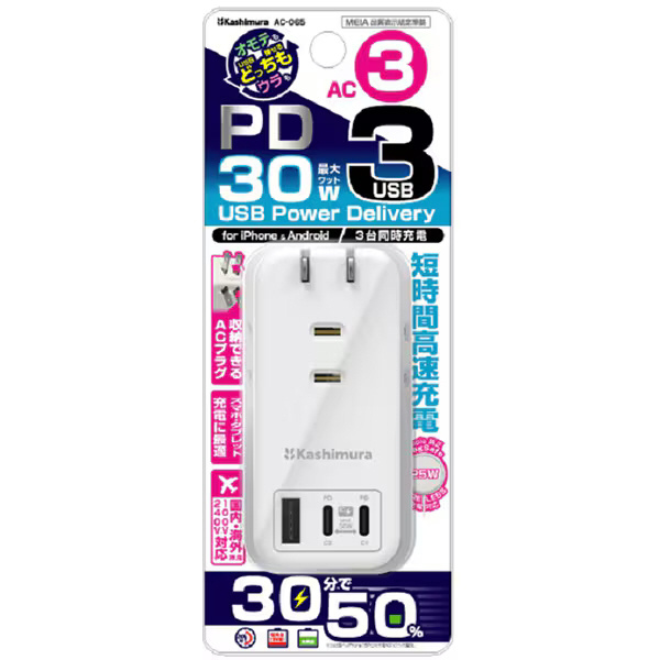 電源タップ AC3 USBA+C2 PD30W 自動識別 リバーシブル AC-065