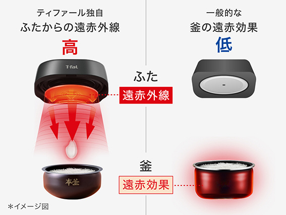 ティファール独自のふたから直接放出する遠赤外線は、一粒一粒のお米に直接熱を届け、