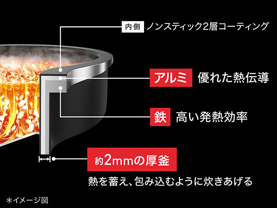 ・発熱効率の良い「鉄」と熱伝導に優れた「アルミ」を組み込み、釜内を素早く均一に加熱。