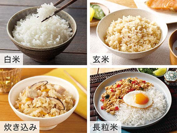 白米・未洗米・雑穀米・長粒米・炊き込み・冷凍ごはん・お粥の全8種類。