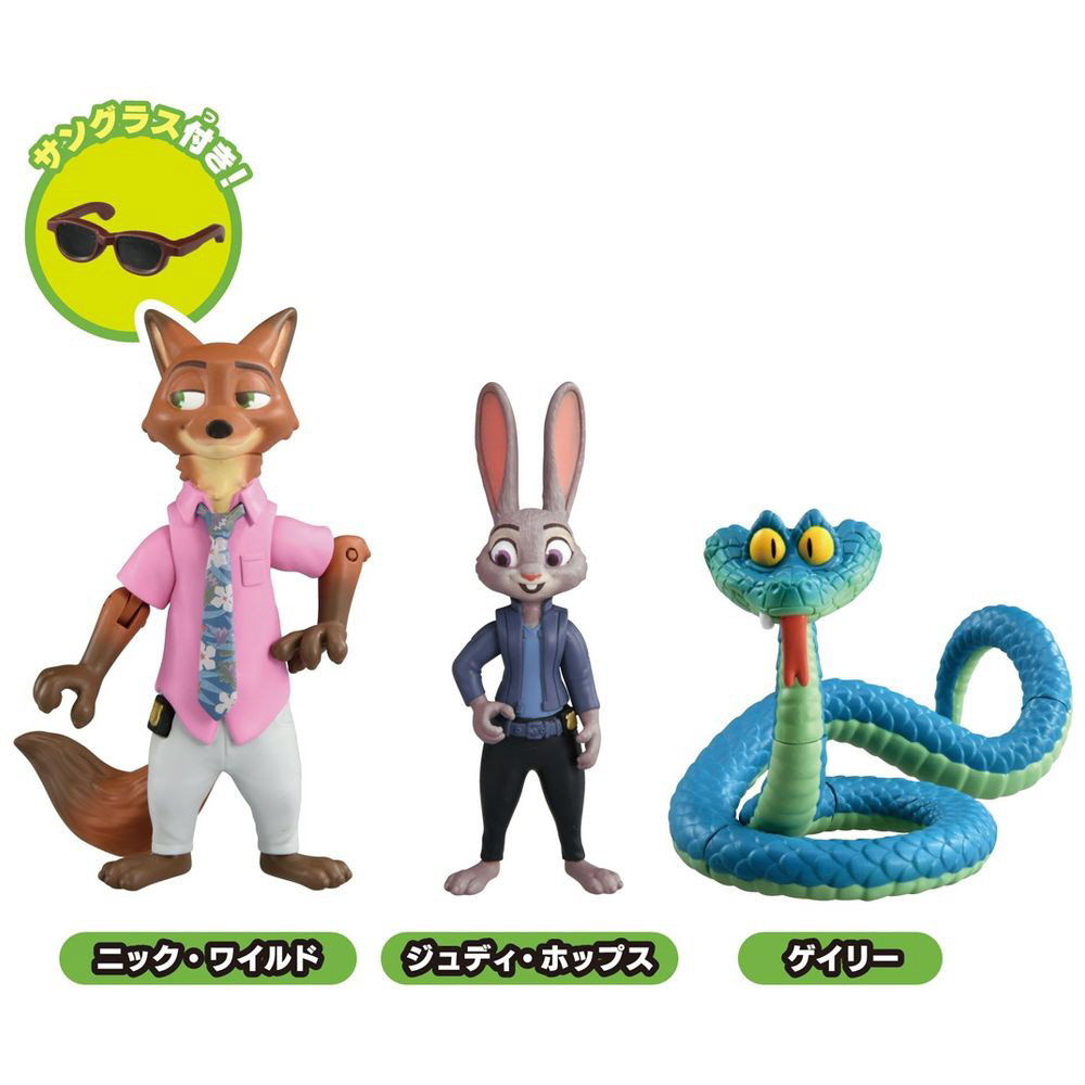 映画『ズートピア2』に登場するニック、ジュディ、そして新キャラクターのゲイリーの動かして遊べるフィギュア3体セットです。
