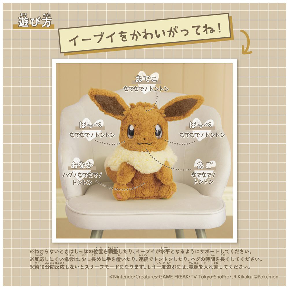 おでこ、ほっぺ、あご、おなかをなでたり、トントンするとイーブイが声でリアクション!