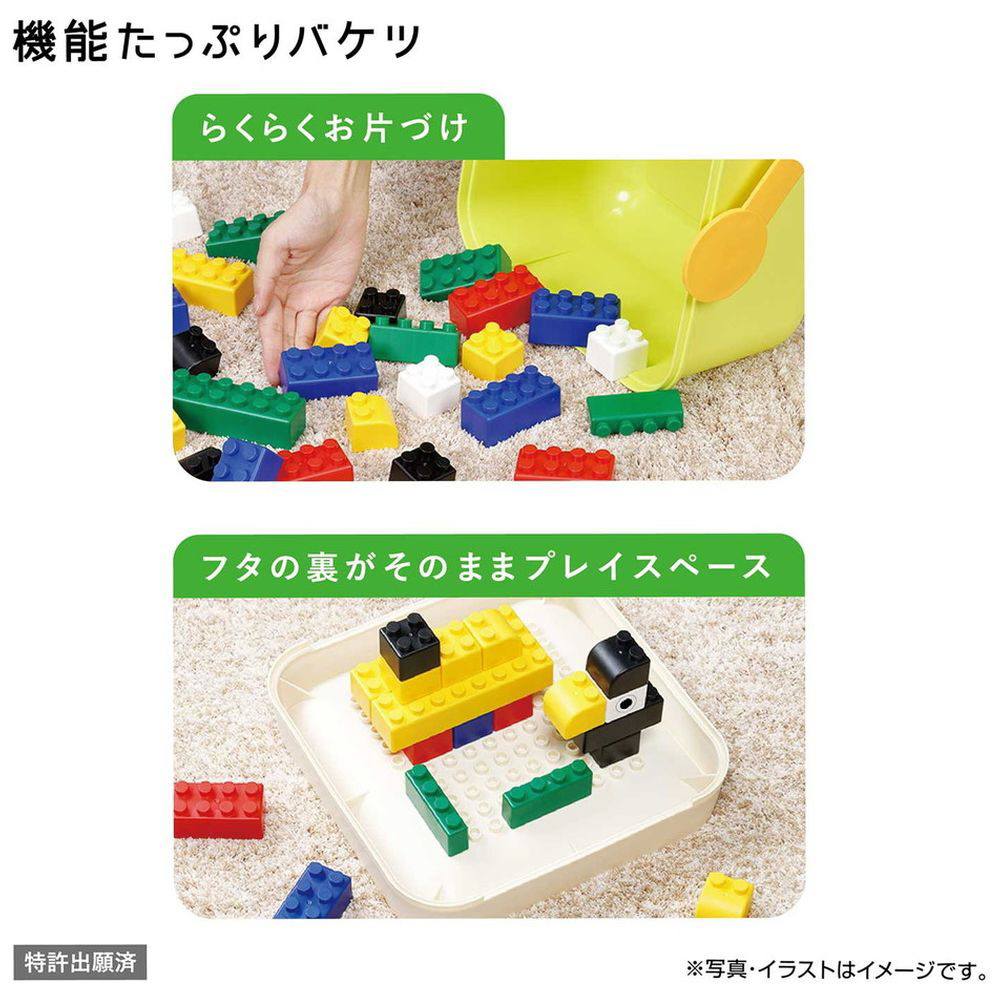 ■バケツは楽しくお片付けできるような形状になっており、フタの裏側にはブロックをはめることもできます。また、リビングになじむよう、外装は取り外しができます。