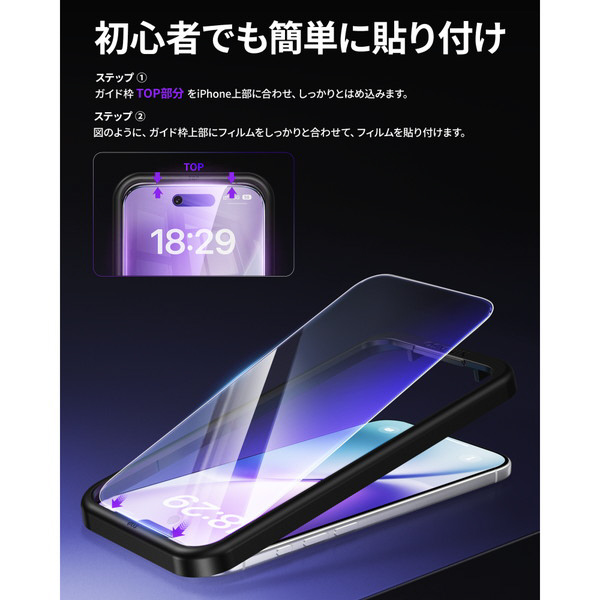 iPhoneの形状にピッタリとフィットするガイド枠に沿って、苦手な方でも確実にフィルムを貼り付けられます。貼付け前のクリーニングに便利なクロスやホコリ取りシールも付属しています。