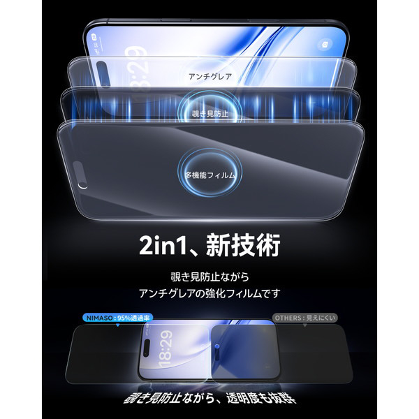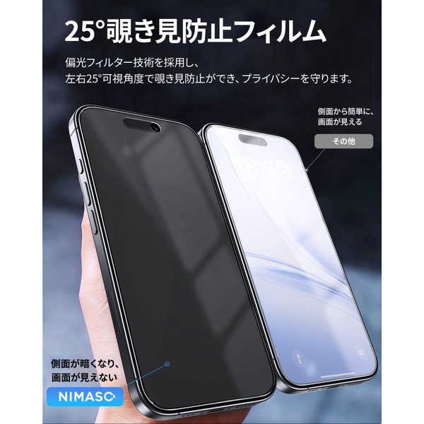 ケースに干渉しないのぞき見防止ガラスフィルム。のぞき見防止加工により左右180度からの視線をブロック、プライバシーを守ります。NIMASO独自のガイドBox「バリ楽」採用。パッケージと一体化した「バリ楽Box」で今まで以上に貼付けがカンタンになりました。フィルムがセットされているバリ楽BoxにiPhoneを被せてシートを引っ張るだけで確実にフィルムを貼付けられます。
