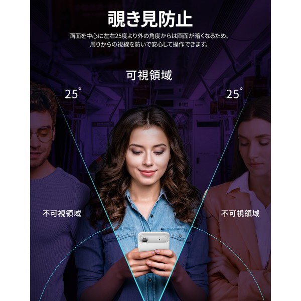 ケースに干渉しないのぞき見防止ガラスフィルム。レンズフィルム付き。カンタン貼付け用ガイド枠同梱で、苦手な方でも手軽にフィルムを貼り付けられます。のぞき見防止加工により左右180度からの視線をブロック、プライバシーを保護します。