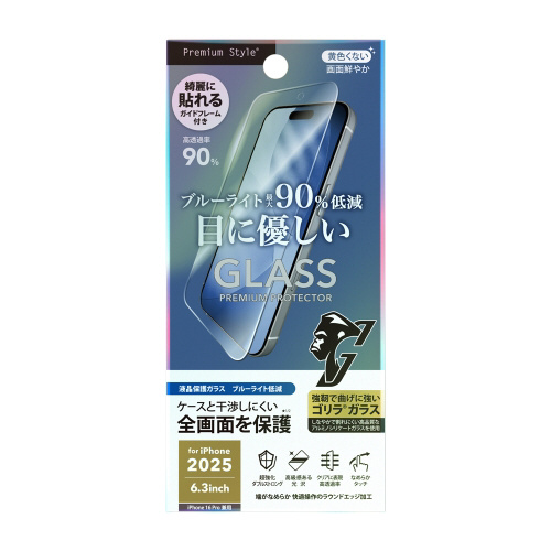 iPhone 17 / 17 Pro / 16 Pro 用 液晶全画面保護ガラス 2倍強化/ゴリラガラス Premium Style ブルーライト低減 PG-25AGL06GBL
