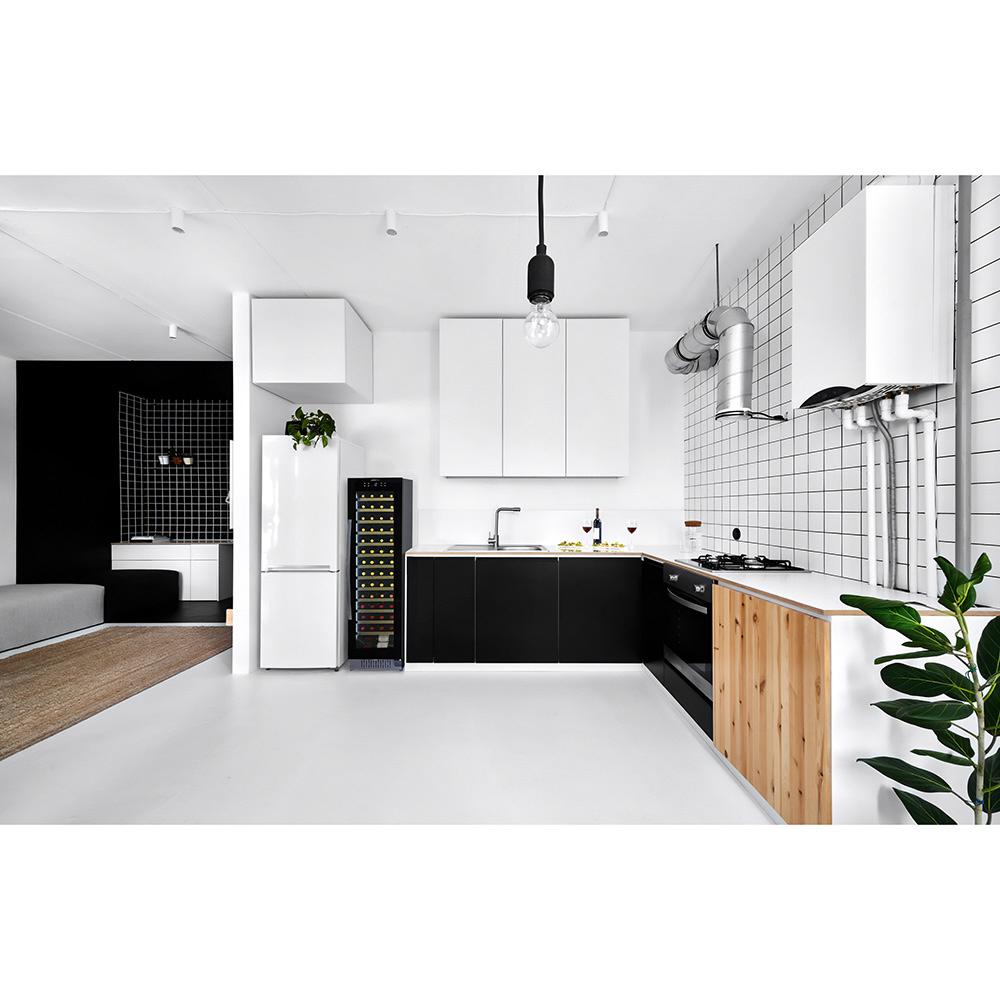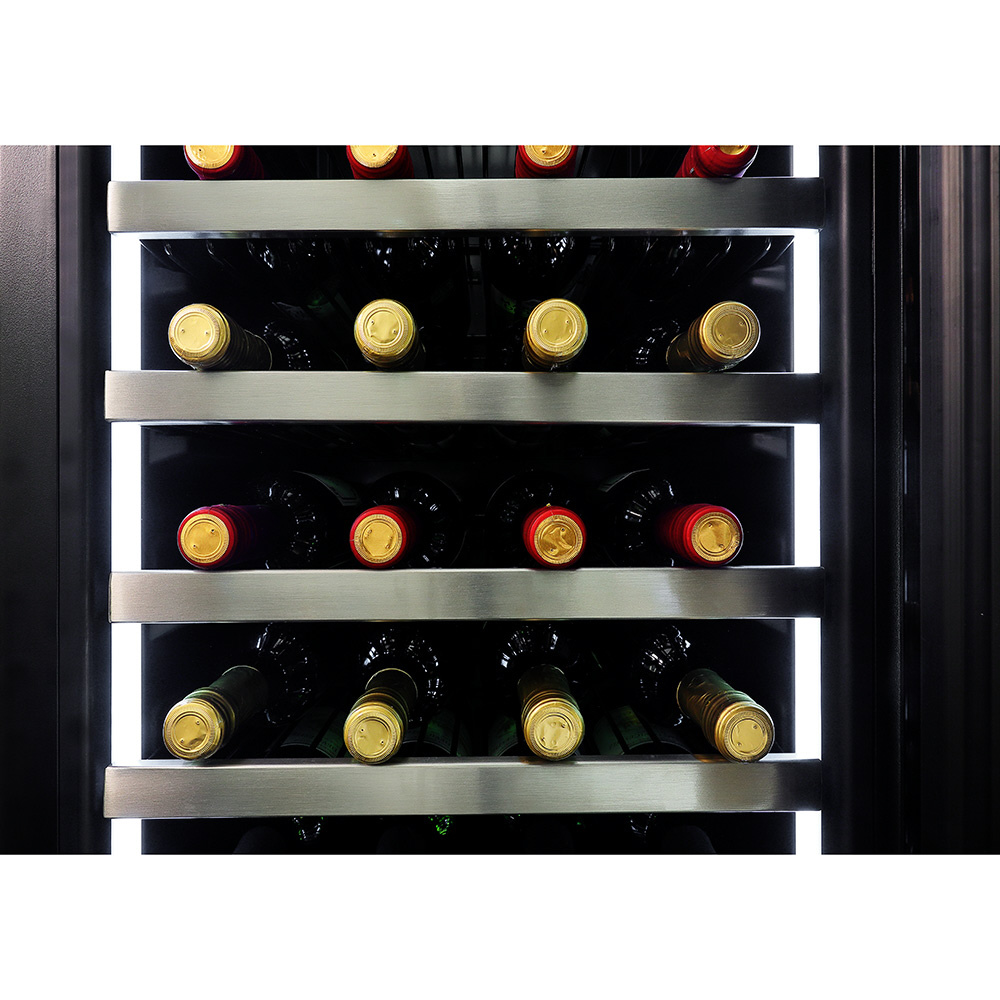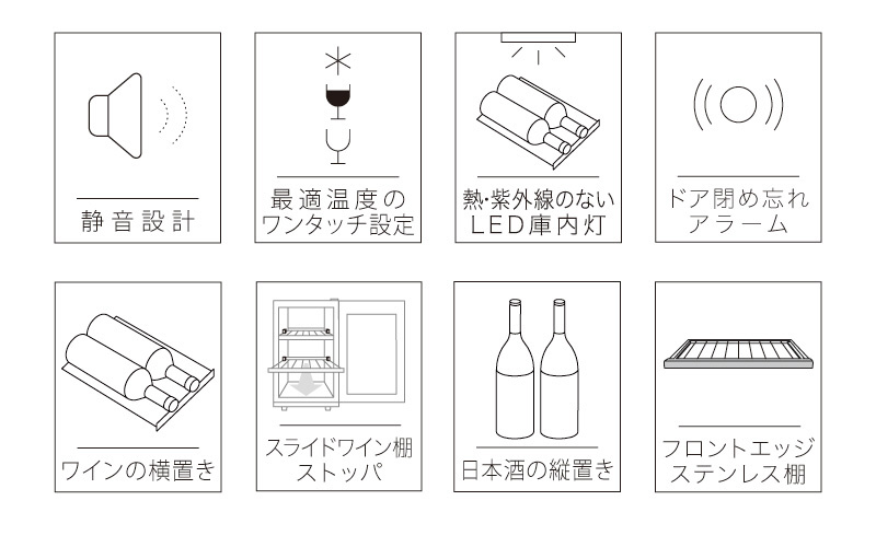 庫内両側面には庫内を美しく彩る4段階調光機能付きの大型LED庫内灯、シェルフの落下を防ぐ棚ストッパ、ドアが周囲の機器と干渉しにくい120°ドアストッパやドア閉め忘れアラームなど実用的な機能に加えを多く備えているほか、信頼性の高い性能を備えた「スマート&フレキシブル」で高性能な「くらしに溶け込む」美しいセラーに仕上げています。